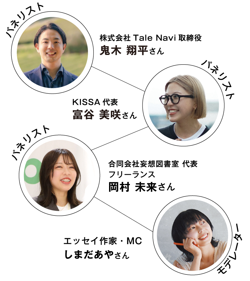 「やりたいこと」ってなんだろう。わくわくした気持ちや、自然と湧き出るエネルギーの源にある思い。それをどのようにみつけ、実践していくのか。その過程でぶつかる“むずかしさ”はどんなものなのか。観光、飲食、本、様々な分野で活動する奈良の若手起業家たちのトークセッション。学生時代からの変化、試行錯誤の軌跡を実体験にもとづき掘り下げていきます。やりたいことに素直に向き合ってきた人たちと出会い、枠組みにとらわれないまっさらな自分で、これからの人生について考えてみませんか?
